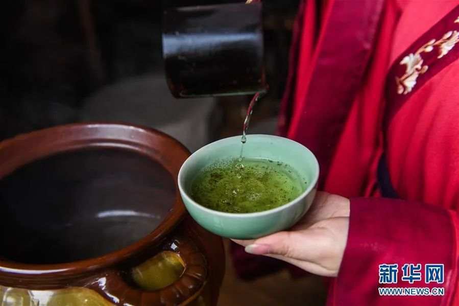 茶艺师按照传统工艺将茶粉、盐等放入水中搅拌并煮开,制成古法茶汤。新华社记者徐昱摄