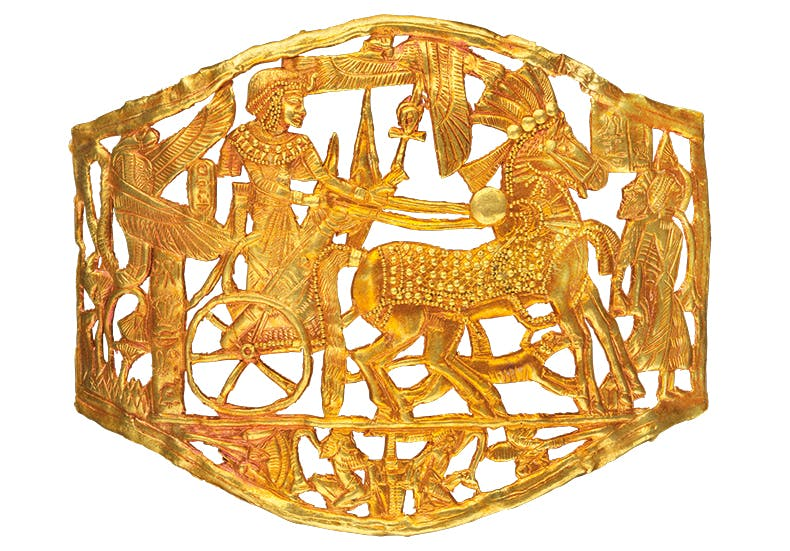 图坦卡蒙墓的镂空金纪念匾,描绘了图坦卡蒙坐在战车上。开罗大埃及博物馆藏
