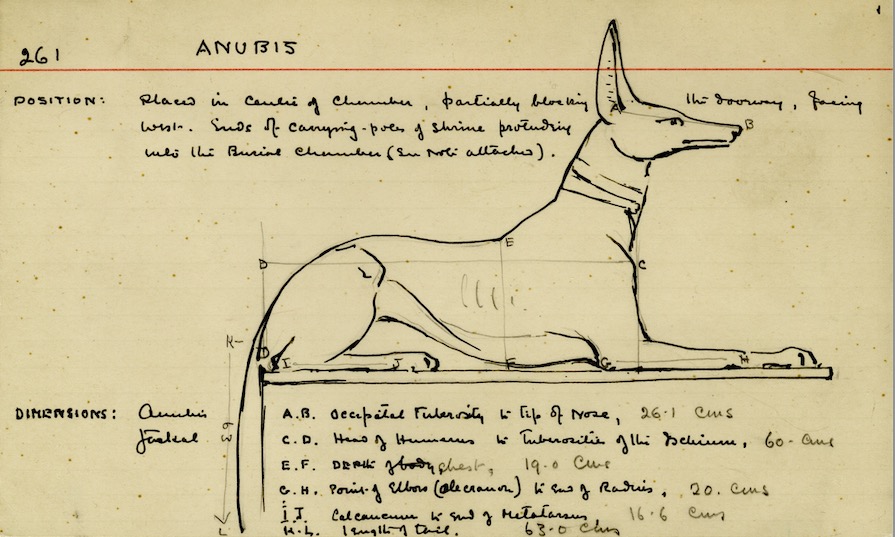 卡特的一张记录卡,上面有他画的阿努比斯(古埃及神话中的死神,以胡狼头、人身的形象在法老的葬墓壁画中出现),并附有注释和尺寸。©牛津大学格里菲斯研究所