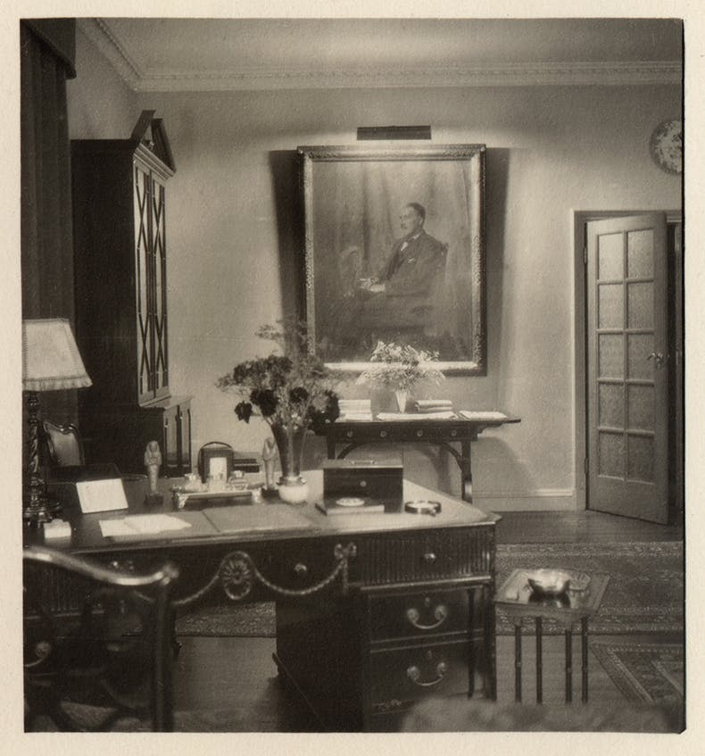 卡特在伦敦肯辛顿的公寓,由卡特在20世纪30年代拍摄。桌子上可以看到两个图坦卡蒙沙比提雕像。佩吉·乔伊埃及学图书馆提供