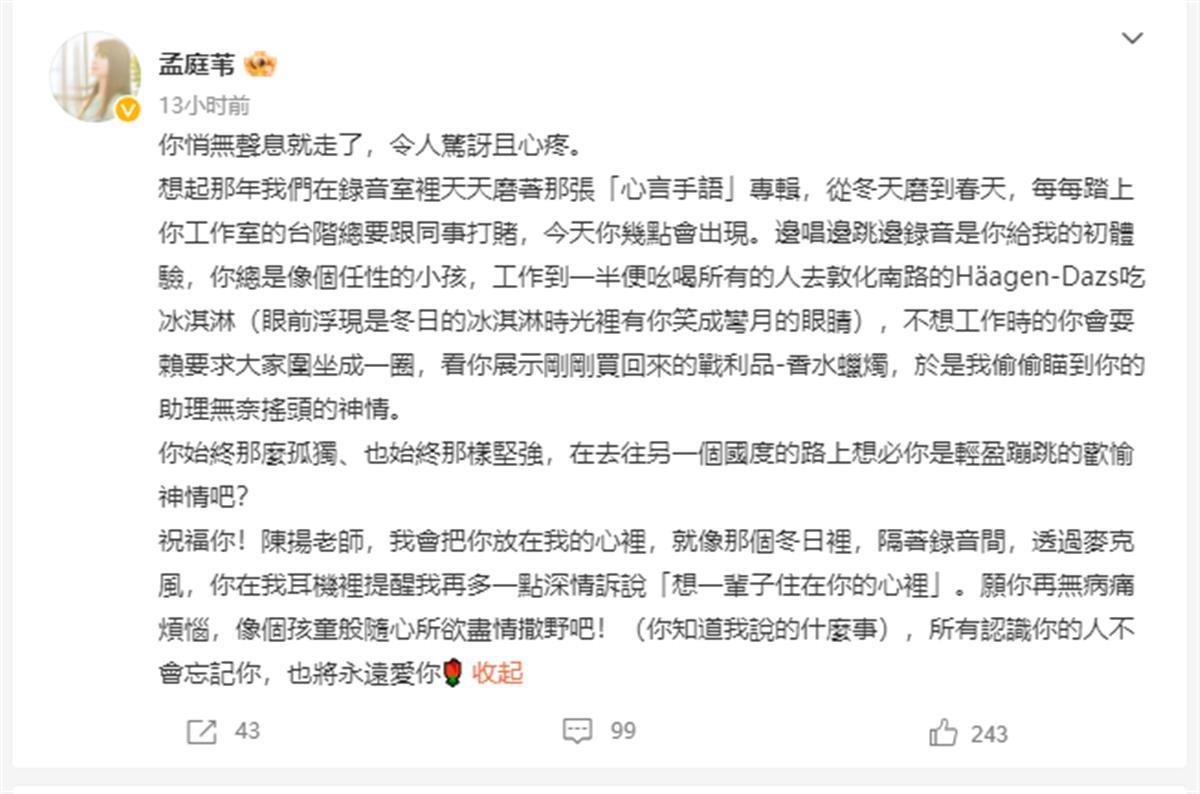 孟庭苇发微博悼念陈扬 (图片来源:微博)