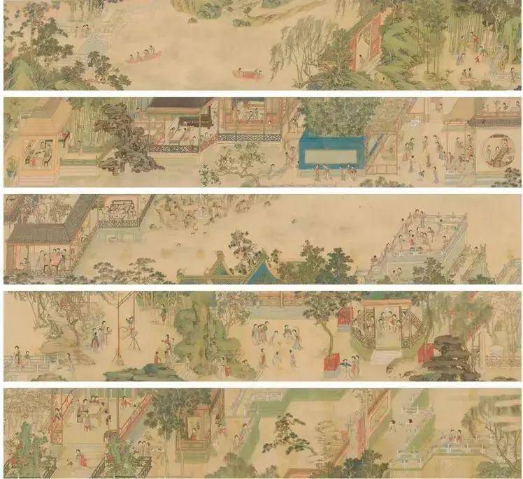 序篇展出的近14米长的清代《仕女行乐图》,呈现出古代女性丰富多彩的消闲活动。画卷中描绘有逾二十个女子活动场景,包括玩蹴鞠、荡秋千、投壶、棋弈等。