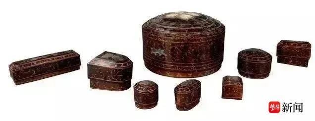 展出的这套西汉七子梳妆奁盒是布脱胎,盖作盝顶式,内装七子小奁,分别为长条形、正方形、马蹄形、圆形、椭圆形。奁盒主要用来放置化妆用品和梳妆器具。如铜镜、梳、篦、茀、铜刷、黛板、粉扑、假发、发饰、耳饰及其它小物件,有的多达一套九件、甚至十一件套。