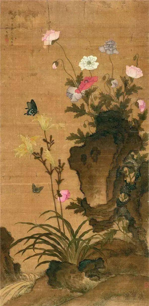 清代女子马荃生于书画世家,祖孙三代皆擅画,家学渊源。她有众多女弟,皆为同乡闺秀,其中不乏摹马荃花鸟能乱真者。马荃的花鸟画一般设淡色,不蓊染,虽说是供人焚香清赏的一类作品,但画中气势充盈。那些柔弱的花草纤芽在她的笔致下看来无不生机盎然,展出的《花蝶图》是一幅尺幅颇大的绢画,画面气韵闲逸,花势芬芳。图中罂粟与拳石形成鲜明的对比,一妖娆艳丽,一厚重笃实,挺生于拳石旁的数株罂粟花,或怒放或含苞,色泽鲜湛,“盖用丹砂、胭脂、花青等合墨细细渲染十数遍”,遂使花容精气内含,而英光外发。牡丹碧桃,罂粟蕙兰流露出其家学的渊源,家族的气质以及马荃作为一女性性灵的“如花”风貌。