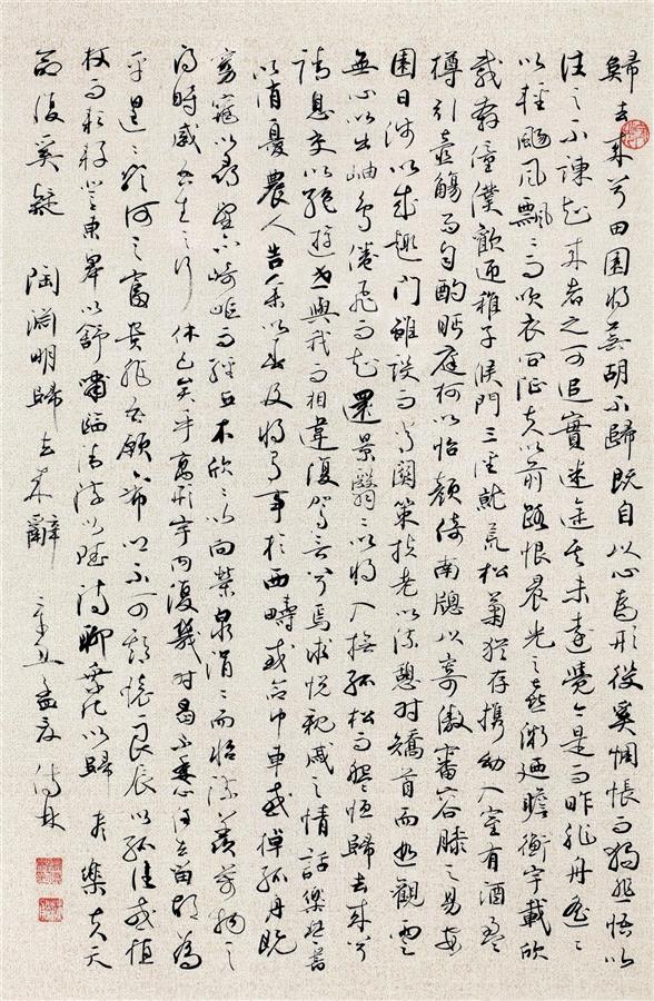 钱锺书先生《谈艺录》开篇“诗分唐宋”有言:“唐诗多以丰神情韵擅长,宋诗多以筋骨思理见胜”;又谓,“少年才气发扬,遂为唐体,晚节思虑深沉,乃染宋调”。传林说,他以前的字里可能带着几分“少年才气”,尤其又是军旅中人,不知收敛,喜欢“逞才”,所以整体风格上有点“飘逸”和“烂漫”。但回到湖北后,尤其是最近几年,不断读帖读碑,补读传统文化书籍,越加领悟到字要经得起“远看”的道理,每一个字的横竖撇捺、一点一划一弯钩,都应该写到家,就像一个堂堂正正的中国人,哪怕单腿站立,也要稳如泰山一样。所以,他近些年写的字,飘逸之气有所收敛,可能更多是“以筋骨思理见胜”,与清正和沉稳中独标情愫。他的《陶渊明诗钞》《辛弃疾词》等,皆是运笔稳重而秀健,刚柔相济,收放有度,即使最细微的笔触里也不失力量和风骨。