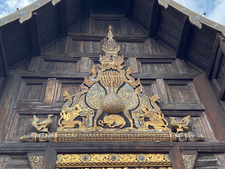 1875年,第七代清迈王英塔腊威柴亚暖(Inthawichayanon,约1873-1896年在位)将第五代王马哈塔腊帕特(Mahotaraprathet,1847–1854年在位)居住的柚木大殿拆解捐给了潘岛寺(WatPhanTao)。这批柚木在潘岛寺被建成了一座新的大殿。另一说是这座大殿是第五代清迈王自己生前修的金殿。无论如何潘岛寺的这座大殿和清迈王室关系密切。时至今日这座大殿的门楣上仍有一个非常华丽的孔雀标志。在缅甸的传统中孔雀是王权的象征(反光的玻璃片是缅式装饰的典型特征),此处也是缅甸文化对兰纳影响的一个例证。孔雀旁边的那迦(Naga,蛇王)是佛教的护法神。标志最下方的狗据信是马哈塔腊帕特本人的生肖。