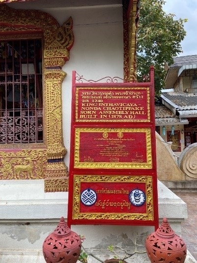 颇为神奇的是,除了王太子学校的雕像,清迈城东的圣芳寺居然专门为达拉拉斯密公主(DaraRasmi,又写作Dararusmi),立了一块碑。上文提到,她是暹罗拉玛五世的妃嫔。1909年,拉玛五世临终前,她回到了故乡清迈,在圣芳寺捐建了一座佛堂,大概是为她自己的身后事考虑。于是一座显眼的功德碑被立在了佛堂前,提醒曾经有这位公主的存在。正是因为她和暹罗王室的这一层特殊关系,她得到了公开的纪念。反倒他父亲的金殿前只有一块简易的木牌。