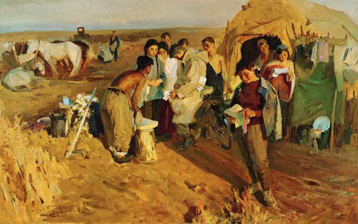 黄昏时刻,邮递员来到垦荒驻地,于是我们可以看到拆阅家书、笑意盈盈的女青年,以及围在邮递员周围朝气蓬勃、翘首以盼的青年们。这是“北大荒”一个平凡的场景,被画家用粗犷凝重的笔触捕捉了下来,于是一段历史定格,新中国第一代青年拓荒者的形象跃然纸上。