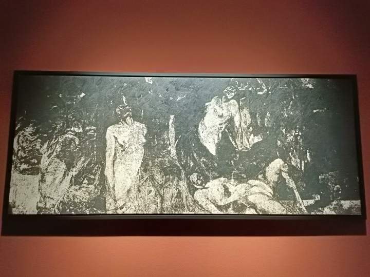 展览中有一件特别的作品,它并非原作,而且只能作为复制件展出。虽然复制品十分模糊、细节分辨不清,却依然震撼人心。这是林风眠1929年创作的《人类的痛苦》,浙江油画最早的现实主义历史题材作品之一,原作已毁。