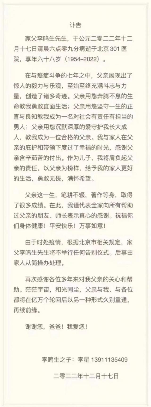李鸣生之子李星在《讣告》中称:“由于时处疫情,根据北京市相关规定,家父李鸣生先生将不举行任何告别仪式,后事由家人从简操办处理。”