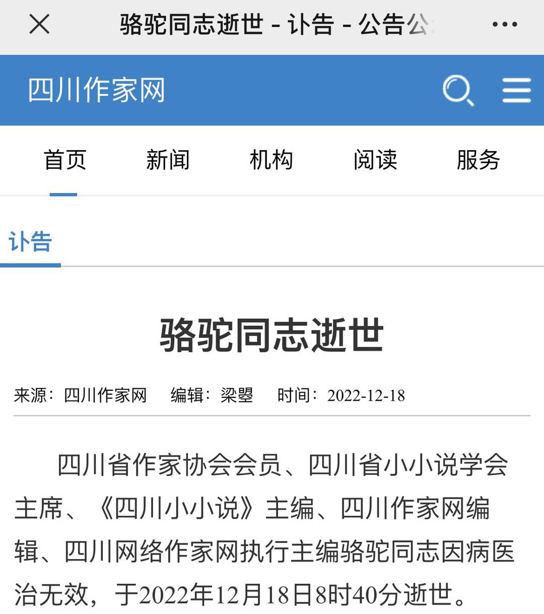 据四川省作协官网消息,四川省作家协会会员、四川省小小说学会主席、《四川小小说》主编、四川作家网编辑、四川网络作家网执行主编骆驼,因病医治无效,于2022年12月18日8时40分逝世。