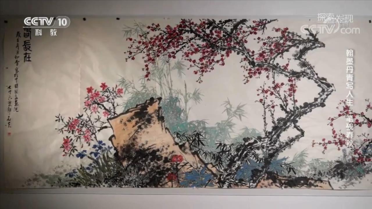 这幅长五米余、高近两米的巨型大写意花鸟画《春长在》,花瓣清新、枝干虬结,它自成的三角形构图给人一种稳定、不屈的美感;花草蓬勃、赭石稳健,石与木分立左右,占据两条黄金分割线,对称带来了极度舒适的同时,树石组合构成了一个新矩形,让整幅画拥有了大气磅礴的底色。