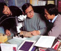 李传夔先生与胡耀明(右)及王元青(左)一起研究张和兽标本图源中国科学院古脊椎动物与古人类研究所