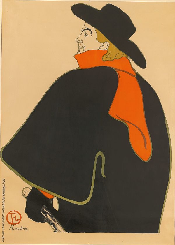 《阿里斯蒂德·布鲁恩特在他的歌舞表演中》彩色石版画,1893,1660x1280mm这是阿里斯蒂德·布鲁恩特委托制作的第三张海报,也可能是四张海报中最令人难忘的一张。布鲁恩特穿着标志性的黑帽子、黑斗篷和披在肩上的红围巾,神色傲慢地背对着观众,让人想到他尖刻幽默的表演风格。大胆的配色、扁平化的平涂色块受到了日本浮世绘版画的启发。
