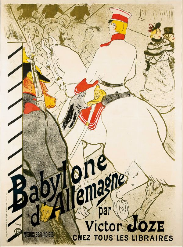 《德国巴比伦》彩色石版画,1894,1564x1221mm这件作品是罗特列克为维克多·约泽的小说《德国巴比伦》出版做的广告海报,上面写着:“所有图书馆都有维克多·约泽的《德国巴比伦》”。这部小说是对德国资产阶级社会的讽刺,海报主角是一个在马背上坐得笔直的德国军官,罗特列克以此强调了德意志帝国统治期间联邦政府对其军事力量的重视。