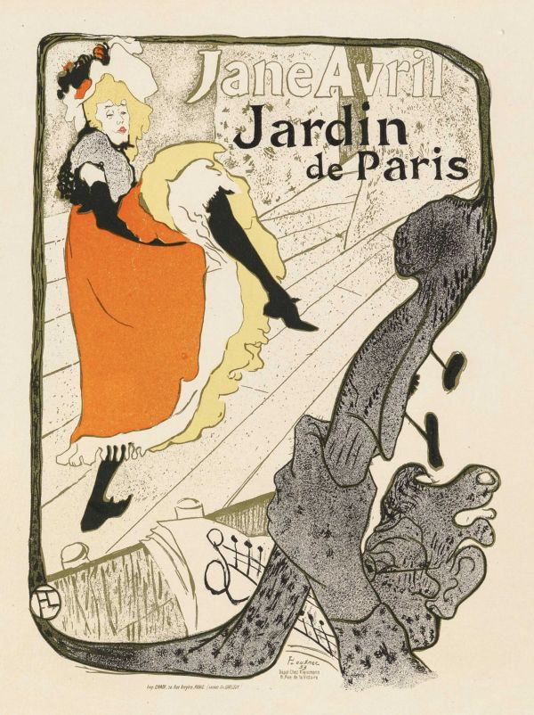 《简·艾薇儿在巴黎花园》彩色石版画,1895,502x417mm这件作品是罗特列克为舞者简·艾薇儿(JaneAvril)在巴黎花园表演而设计的海报。罗特列克别出心裁地将美丽与怪诞的视觉效果并置在一起:看不见脸的音乐家手握着低音提琴的琴颈与舞者灵动的腿部线条形成对比。同时,作品新颖的构图方式也令人印象深刻——倾斜的视角、扁平的形式、简洁的拼接感和随意曲折的线条,这都使得这件海报作品极具现代性。