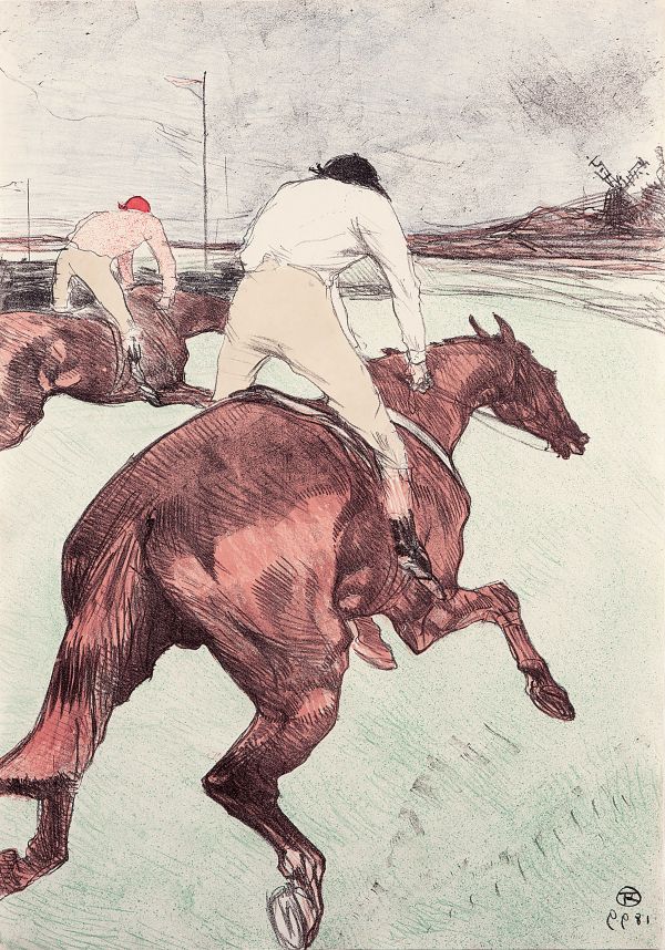 《骑师》彩色石版画,1899,777x622mm马与马术是罗特列克自幼非常感兴趣的主题,马象征着一个运动和冒险的世界,但由于艺术家的身体原因,这个世界对他来说是触不可及的。在这件作品中罗特列克选取了一个特别的创作视角,描绘了两位骑手在赛道奔驰的背影,人与马的姿势都极富动感。