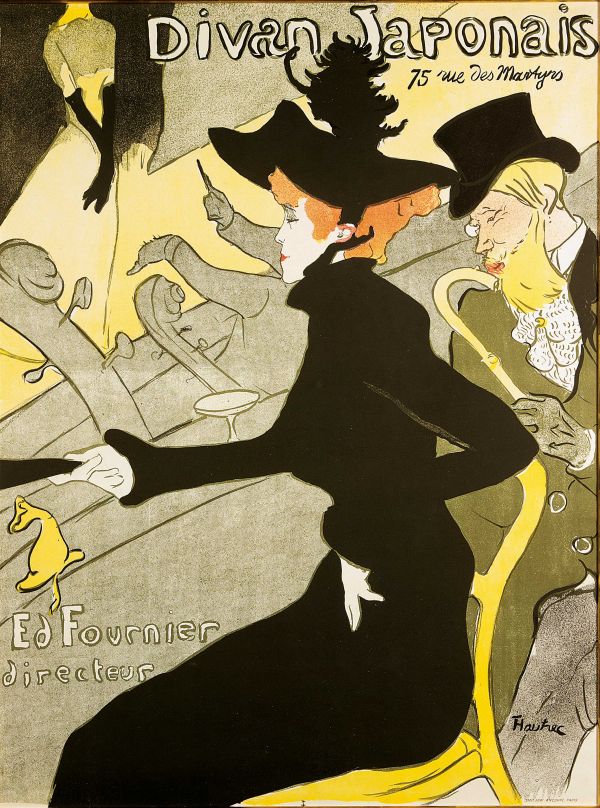 《日本沙发咖啡厅》彩色石版画,1893,1153x953mm巴黎艺术家聚集区蒙马特区的日本沙发咖啡音乐厅在1893年以日本主题风格重新装修,这件作品是罗特列克为其招徕顾客而创作的广告海报。画面的最前方,罗特列克在观众席中描绘了他的朋友爱德华·杜雅尔丁(EdouardDujardin),画面中间是著名的康康舞舞者简·艾弗里尔,她优雅的黑色剪影主导了整个场景,背景中是当时另一位著名艺人伊薇特·吉尔伯特,戴着标志性的黑手套,以人物为中心的构图,轮廓简洁,平涂的色块,这些都是罗特列克艺术海报的典型特征。
