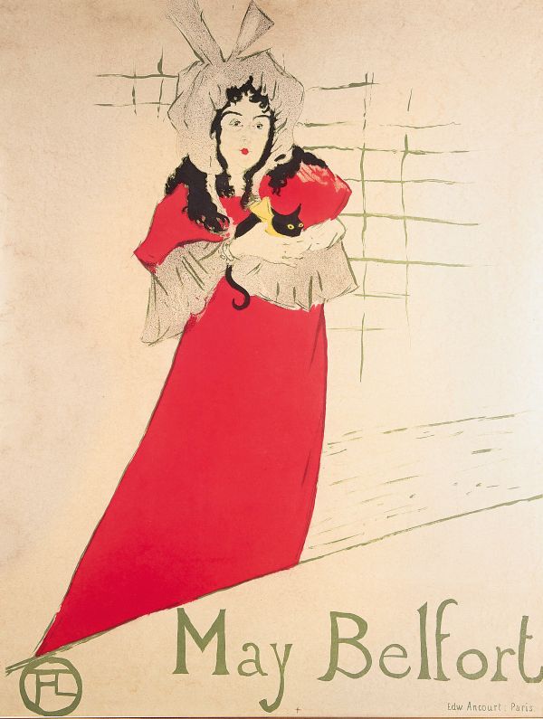 《梅贝尔福特》彩色石版画,1895,1145x942mm梅·贝尔福特是一位爱尔兰女歌手,常穿着袖子蓬松的裙子,戴一顶巨大的帽子,怀抱一只黑猫。这件作品是罗特列克为梅·贝尔福特在巴黎小赌场演出时制作的海报,这件作品还于次年在兰斯举行的国际海报展览中获奖,简单而大胆的构图和平涂的明亮色块是受到日本浮世绘影响的结果。