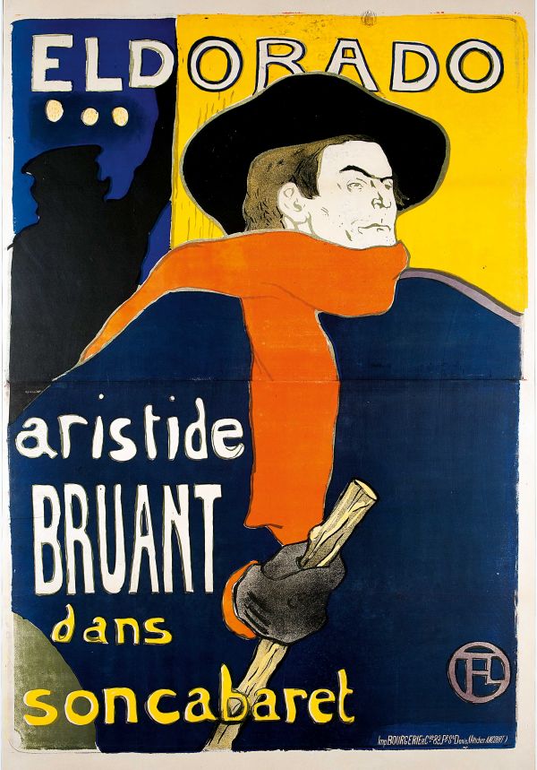 《埃尔多拉多:阿里斯蒂德·布鲁恩特》彩色石版画,1892,1850x1338mm阿里斯蒂德·布鲁恩特是一位法国歌舞歌手、喜剧演员和夜总会老板,罗特列克的好朋友。这件作品是罗特列克为他在斯特拉斯堡大道的埃尔多拉多剧院的演出设计的海报。宽边毡帽、斗篷和红围巾是布鲁恩特标志性服装。海报红黑配色十分醒目,扁平化的平涂色块受到了日本浮世绘版画的启发,手绘字体也是罗特列克精心设计的成果。