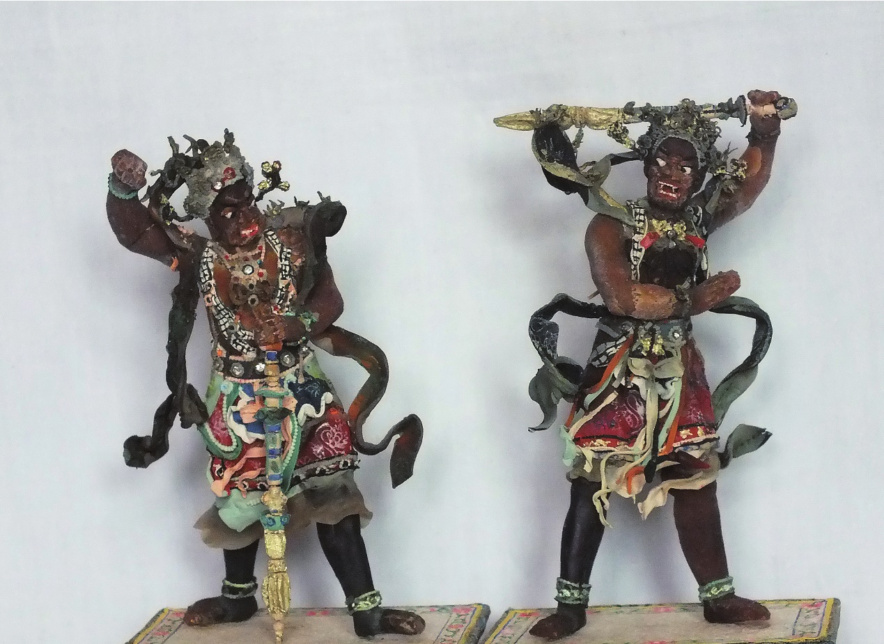 我更喜爱捏穿盔甲的戏剧人物,如《长坂坡》《黄鹤楼》《华容道》中的人物和《西游记》的孙悟空。这些武将头盔上的花纹、铠甲上的扣子、胸前的护心镜,连同背上的旗子,以及旗子上的字迹图形,我都注意做到纤悉无遗。孙悟空左手搭凉棚,右手抓耳挠腮,腋下夹着金箍棒,蜷曲着一条腿站在棉花般的云朵里,其活灵活现的神态,赢得了观众们的称赞。——郎绍安