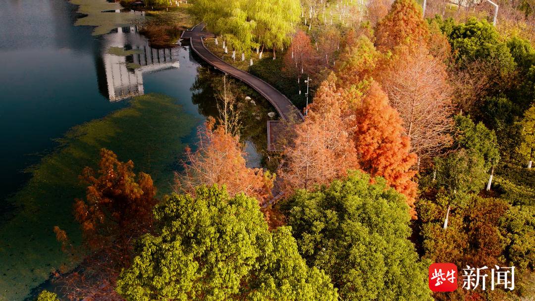 扬子晚报网12月27日讯(记者姜婧仪通讯员尚明)云霞染长天,湖荡清波远。紫金山与青龙山之间、生态廊道之上,麒麟生态公园霜叶红透、层林尽染,颇生美意。
