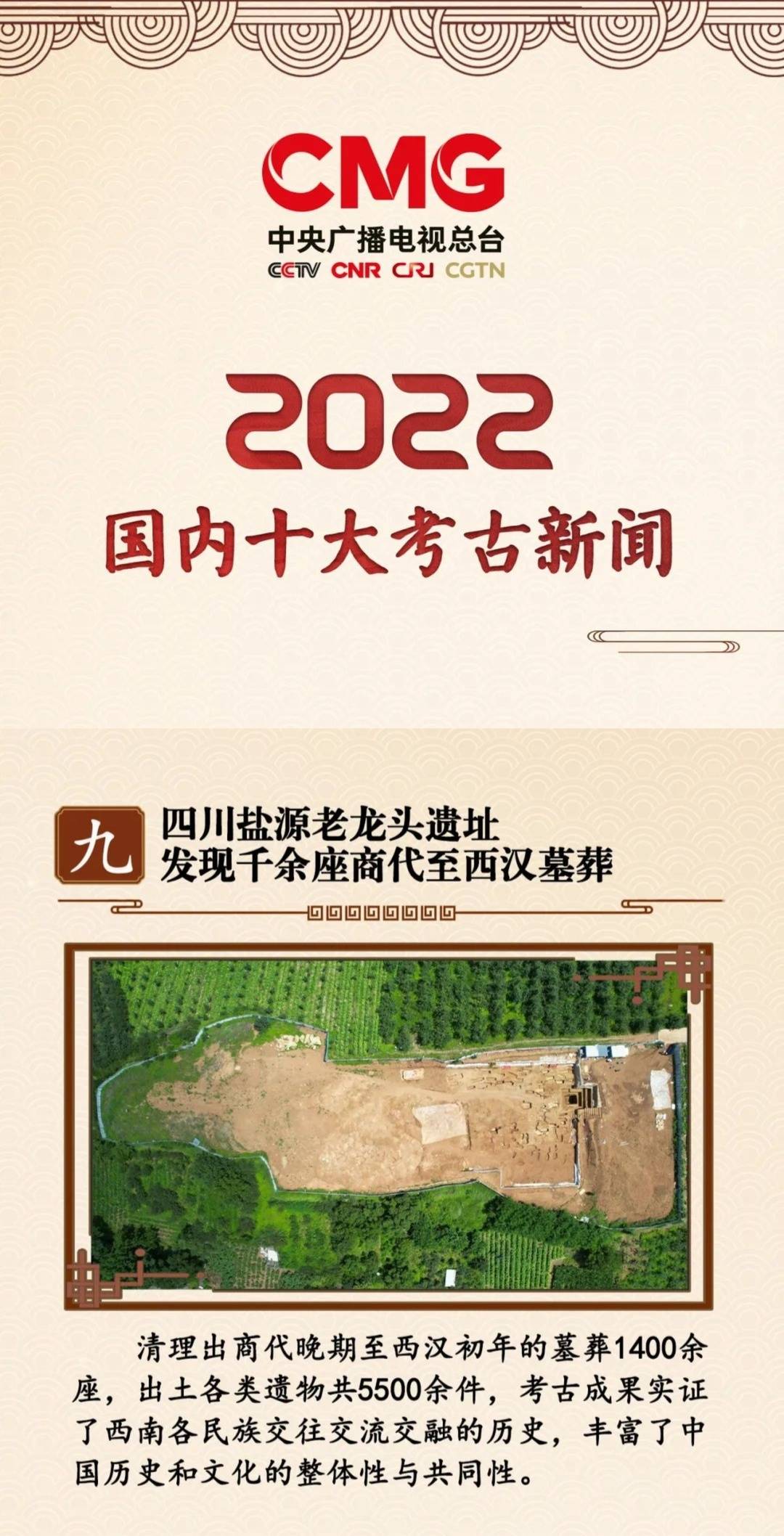 12月24日,中央广播电视总台发布2022年度国内十大考古新闻、2022年度国际十大考古新闻,“四川盐源老龙头遗址发现千余座商代至西汉墓葬”入选2022年度国内十大考古新闻。