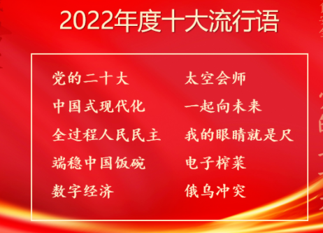 目前各大机构和刊物对2022年网络流行语的评选基本上接近尾声。比如“汉语盘点2022”年度十大流行语选出的是:党的二十大、中国式现代化、全过程人民民主、端稳中国饭碗、数字经济、太空会师、一起向未来、我的眼睛就是尺、电子榨菜、俄乌冲突。