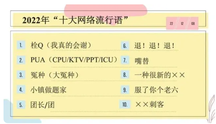 上海《语言文字周报》公布的2022年“十大网络流行语”包括:栓Q(我真的会谢)、PUA(CPU/KTV/PPT/ICU)、冤种(大冤种)、小镇做题家、团长/团、“退!退!退!”、嘴替、一种很新的XX、服了你个老六、XX刺客。