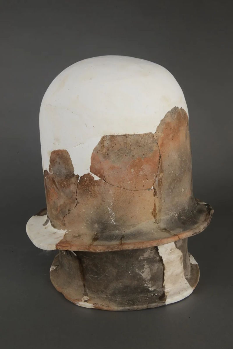 圜底腰檐陶釜,新石器时代·马家浜文化,草鞋山遗址出土,苏州市考古研究所藏将釜类陶器作为炊器是环太湖地区马家浜文化的独特传统,但釜的具体形态则表现出较显著的地域差别。同为深筒状釜,在太湖东岸以草鞋山等遗址为代表的是圜底釜,在太湖西部以骆驼墩等遗址为代表的则是平底釜。但无论哪种釜,在其腰部几乎都会附加环绕一周泥条花边出檐,这类陶釜被称为“腰檐釜”。