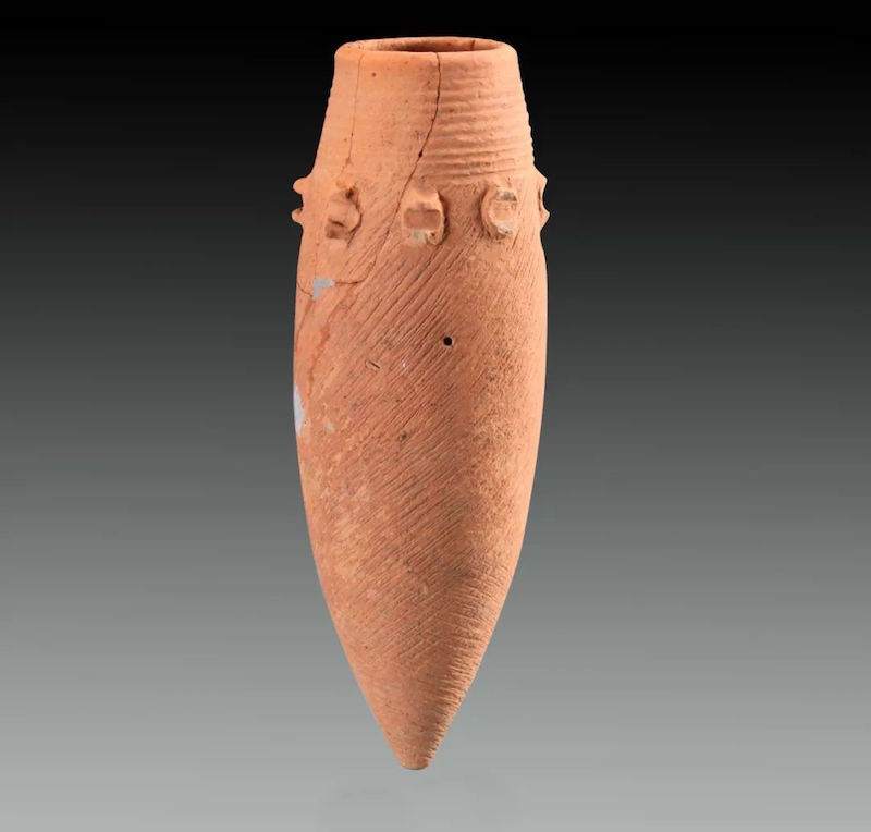 陶尖底瓶,新石器时代·马家浜文化,东山村遗址出土,张家港博物馆藏尖底瓶主要出土于新石器时代仰韶文化半坡、庙底沟、西王村类型的遗址中,是仰韶文化最重要的代表性陶器之一。这件尖底瓶的造型、纹饰以及装饰和颜色,在长江下游地区未见源头,明显具有北方尖底瓶的风格,与西阴文化早期同类制品极度相似,对探讨黄河中游与长江下游的文化传播与交流提供了实物资料。