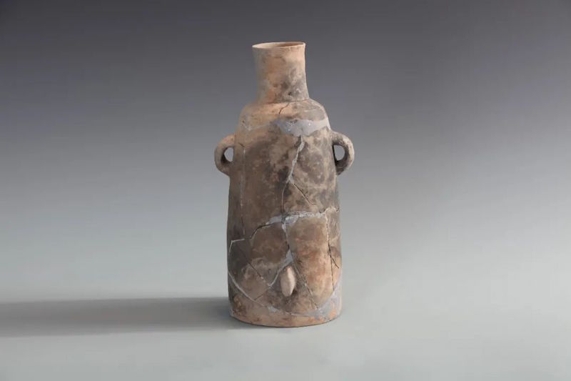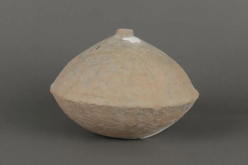陶背壶,新石器时代·崧泽文化,东山村遗址出土,张家港博物馆藏陶背壶是黄河中下游地区大汶口文化时期的特有器型,属于汲水器类。背壶的造型基本是壶形,不同的是壶腹不是圆体,而是一侧扁平、一侧圆鼓,肩下有耳穿,鼓腹下部有喙形或鸡冠状的凸纽,推测是用一根绳子背在背上,扁平一侧贴在背上,绳子通过两个耳穿过,并别在凸起下面固定。由此可见在崧泽文化时期,东山村的原始先民和黄河中下游地区居民产生了文化上的交流。