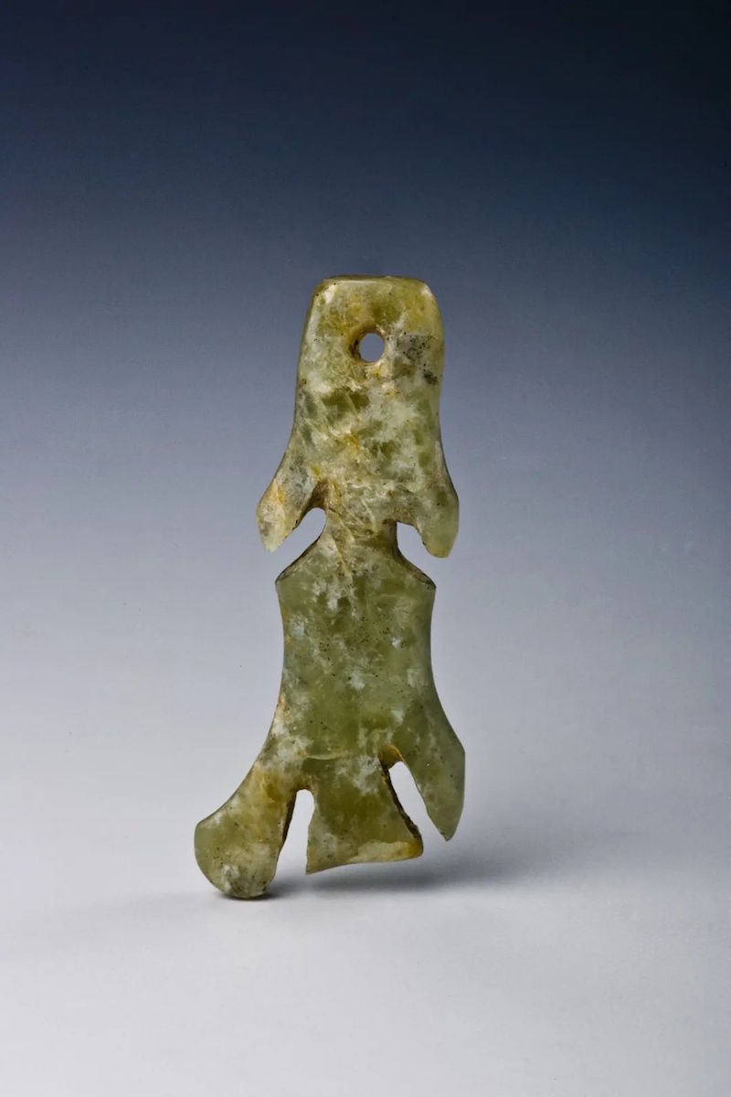 玉鱼形饰,新石器时代·良渚文化,赵陵山遗址出土,昆山市文物管理所藏青绿色,透光,玉质内含有白色雾状及黑色墨色状杂质,完整。取抽象性物体,顶部略平整,上部对穿一孔,近上部及下部线割锼出条形豁口,下部不对称,一侧上翘。通体呈玻璃状光泽,应是作为坠饰使用。