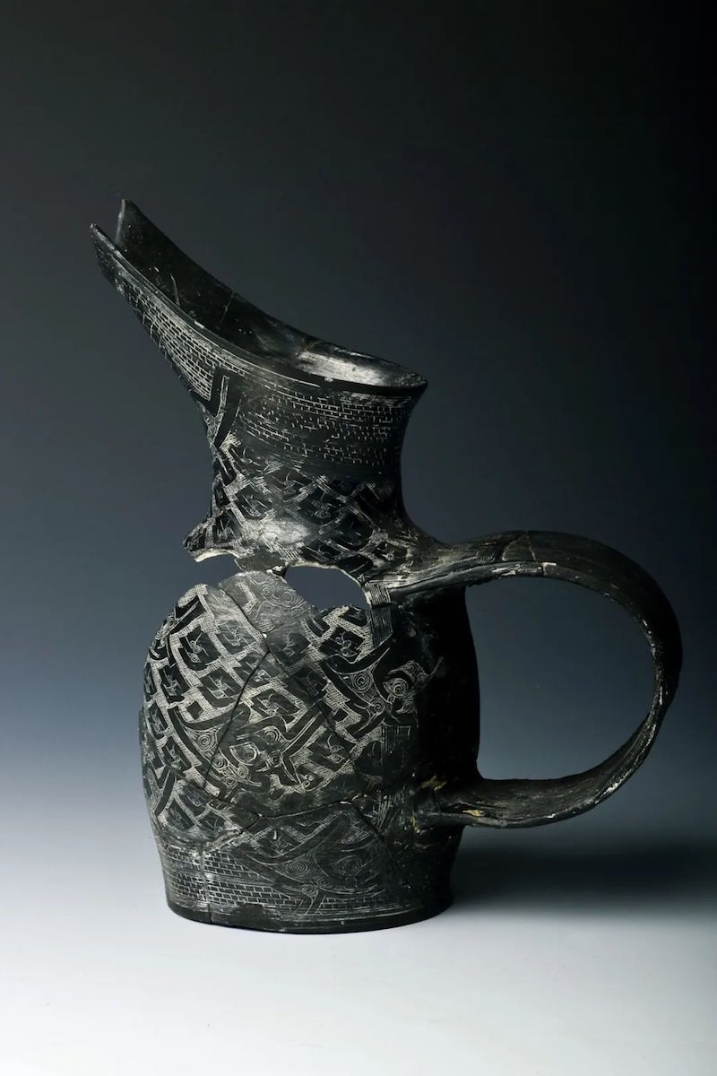 宽把陶杯,新石器时代·良渚文化,绰墩遗址出土,昆山市文物管理所藏此器为泥质黑皮陶,鸭嘴形流,筒形腹,矮圈足。通体菱形网格状内饰鸟形刻纹,鸭嘴形流下以及圈足有稻穗纹样,肩及下腹附一宽把,上有40多根泥条贴面。该种陶杯为良渚文化时期盛水器中的典型陶器,其纹饰繁复,制作相当精良,充分反映了当时原始先民高超的制陶水平和独特的审美情趣。