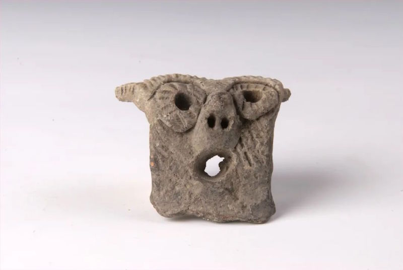 兽面陶器耳,新石器时代·马家浜文化,嘉兴马家浜遗址出土,嘉兴博物馆藏该器为器把之一部分,面部肌肉一边松弛,一边紧绷,表情显得十分丰富。该器形象虽为兽面,却有人的表情,属人格化的动物形象。这件罕见的史前陶塑珍品与后期出现的某些兽面形象有着十分相似的痕迹,为随后的良渚文化神人兽面纹亦或是商代兽面纹的认读找到了历史原型,是一件研究史前神人与兽面融为一体造型的珍贵资料。