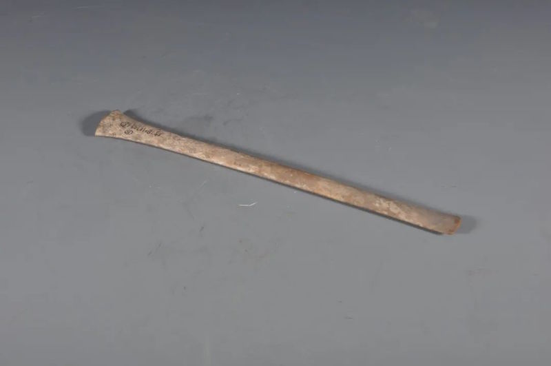 骨笄,新石器时代·马家浜文化,常州圩墩遗址出土,常州博物馆藏此器是由动物骨管加工而成,骨管的关节部分形成自然的笄帽。笄,为古代女子用以装饰的一种簪子,用来插住挽起的头发,通常制作较为精致,新石器时期常出土于墓葬内墓主头骨附近。到了历史时期,形成了女子十五岁结发,以笄贯之的“及笄”礼,从而成为女子成年的象征。
