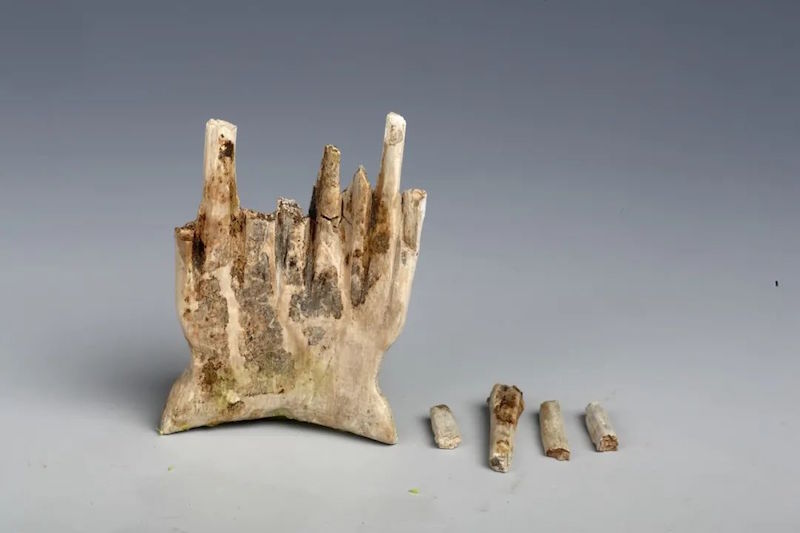 象牙梳,新石器时代·马家浜文化,绰墩遗址出土,昆山市文物管理所藏象牙质,长方形,尾部平面两端都刻划双线,两侧边内凹,如同绕线板;前部加工有8根齿,仅一根保持原高度,其余均残缺。该器是梳理头发的用具,牙梳下端有8个梳齿,即用于梳理头发,或别在发髻上作为装饰用品。在许多新石器时代遗址中,发现过骨簪、玉簪、玉发箍等固定发式或美发的用品,可见当时的人们十分重视梳理头发,并流行梳髻。