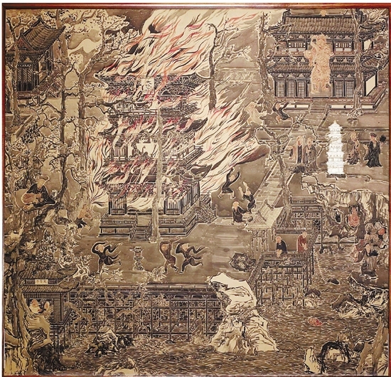 组画中的其中一幅,主题是大悲楼失火,由林海钟主笔。他描摹火焰的时候,学生们不自觉地放下画笔,围过来看。有人仿佛听到了木头燃烧“噼噼啪啪”的声音。这是活泼泼的中国传统文化的声音。