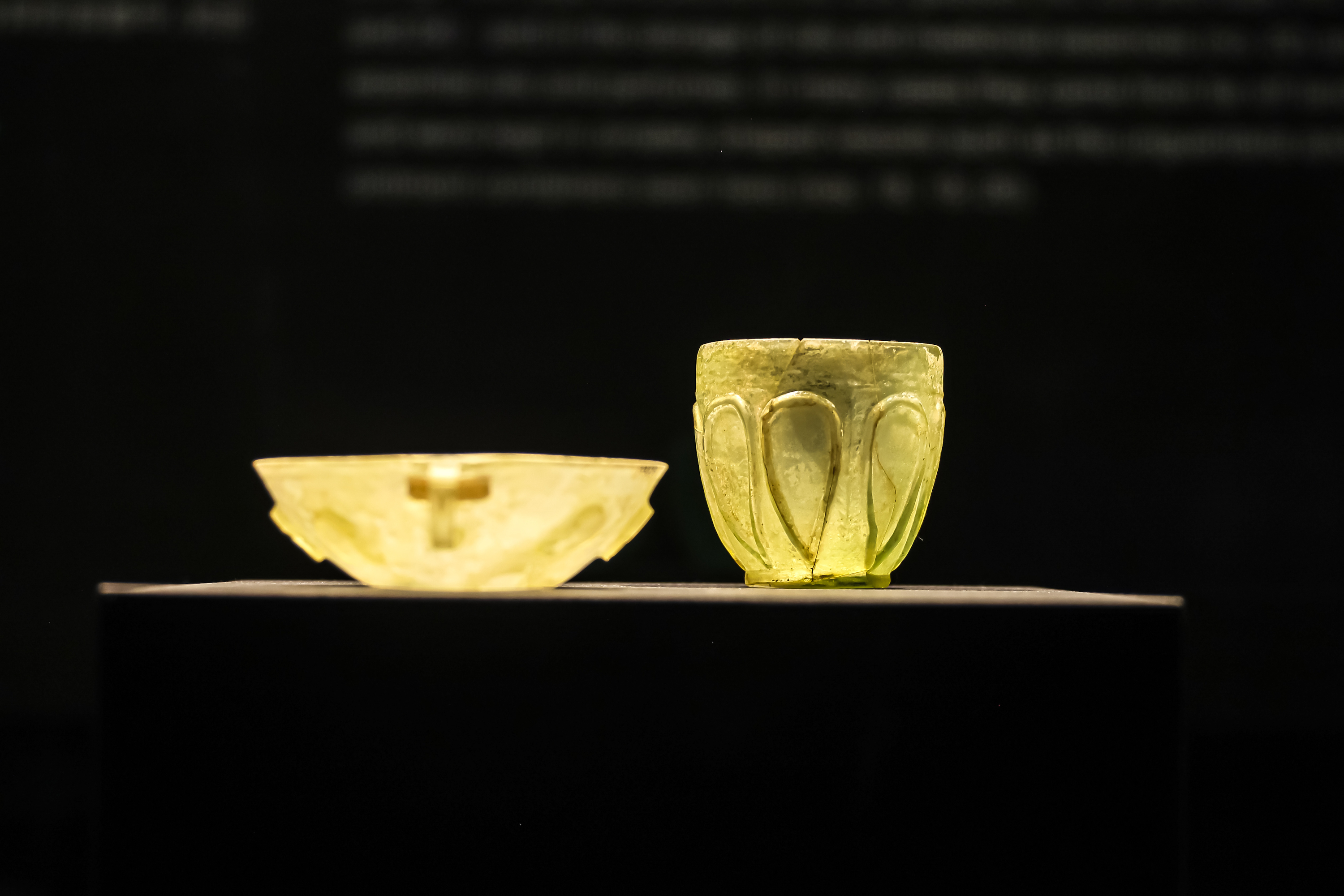 《双柄刻纹杯》与《浮雕玻璃杯》(右)玻璃,公元1世纪,庞⻉那不勒斯国家考古博物馆藏
