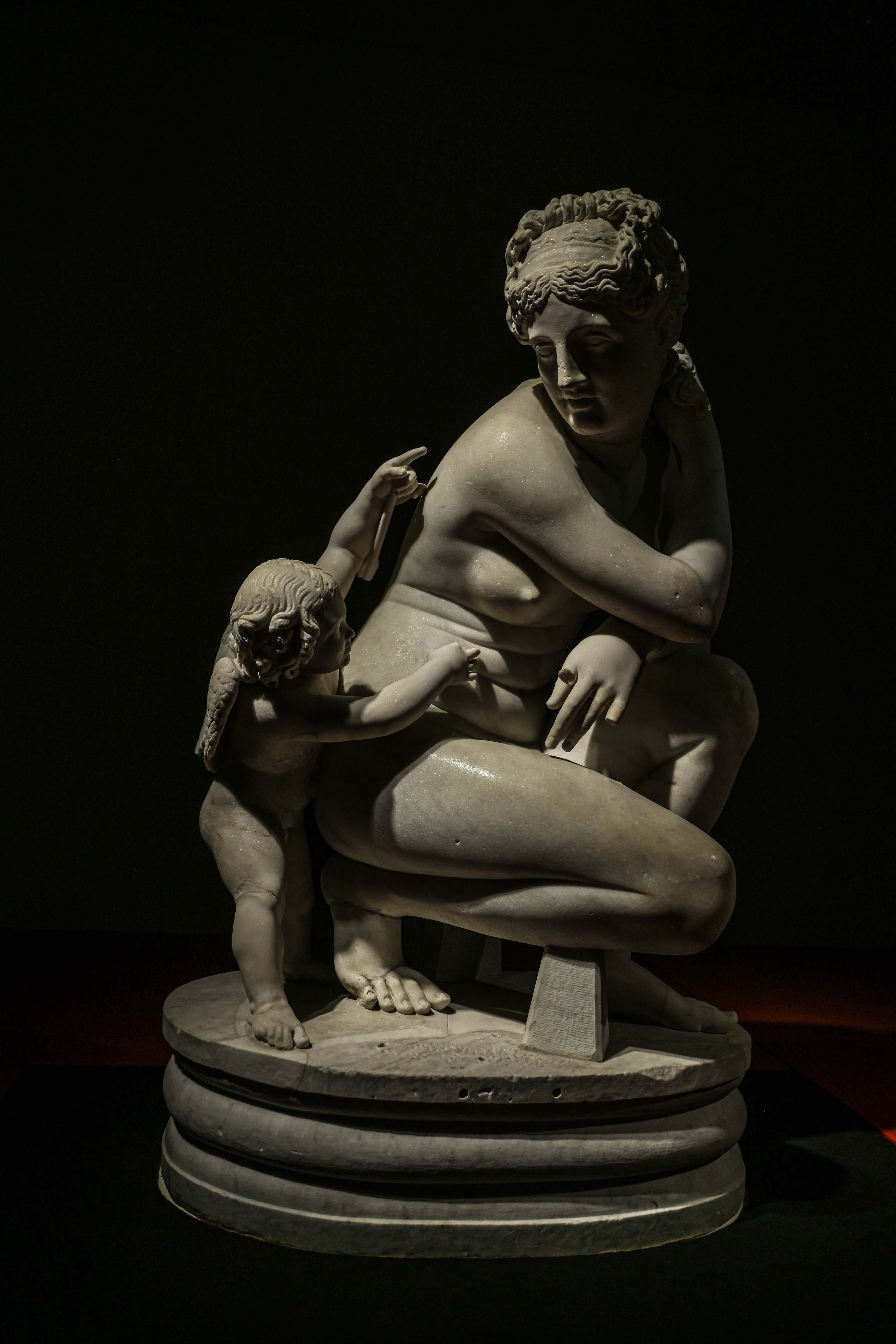 希腊神话中的阿佛洛狄忒,是罗⻢人口中的维纳斯,爱与美之神赋予了世间万物吸引力。《俯身的阿佛洛狄忒与厄洛斯》是2世纪的罗马大理石雕塑,描绘了维纳斯蹲伏在洗浴台上。古希腊雕塑家普拉克⻄特列斯,用女神身体的向下蜷曲来表现美。更早前,这个构思源于比提尼亚(今土耳其)的雕塑家杜达尔萨斯为皇室创作的作品,罗马时期广受欢迎,大量用于装点别墅和宫殿花园。