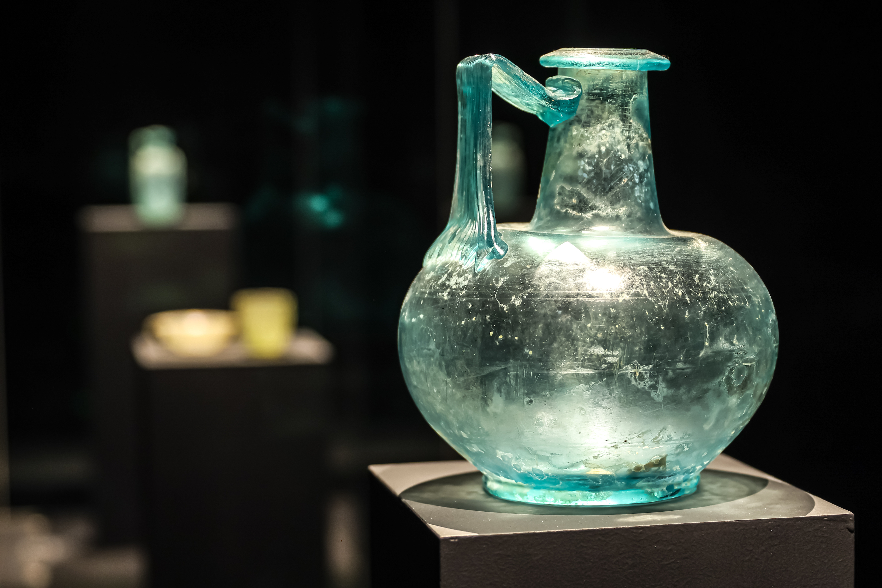 在意大利水城威尼斯,有着举世闻名的玻璃岛,玻璃制品美轮美奂。但当观众贴近展柜凝视聚光灯下来自维苏威火山遗址和庞贝的玻璃《水罐》《浮雕玻璃杯》及玻璃《瓶》,一种“美的理想”跃入眼前。
