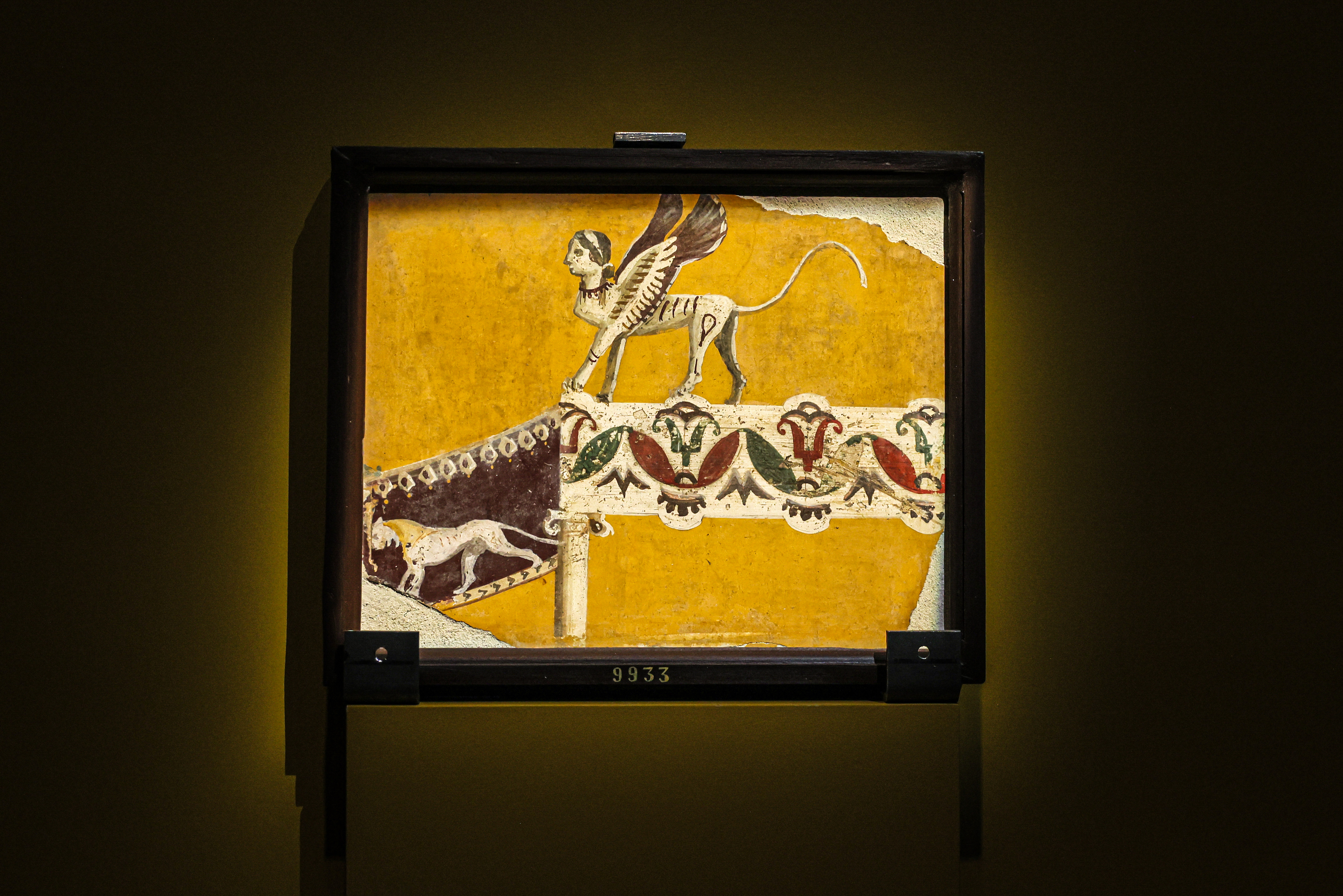 《斯芬克斯像立于壁毯边缘》(庞⻉壁画第三⻛格)彩绘壁画公元1世纪,庞⻉,那不勒斯国家考古博物馆藏