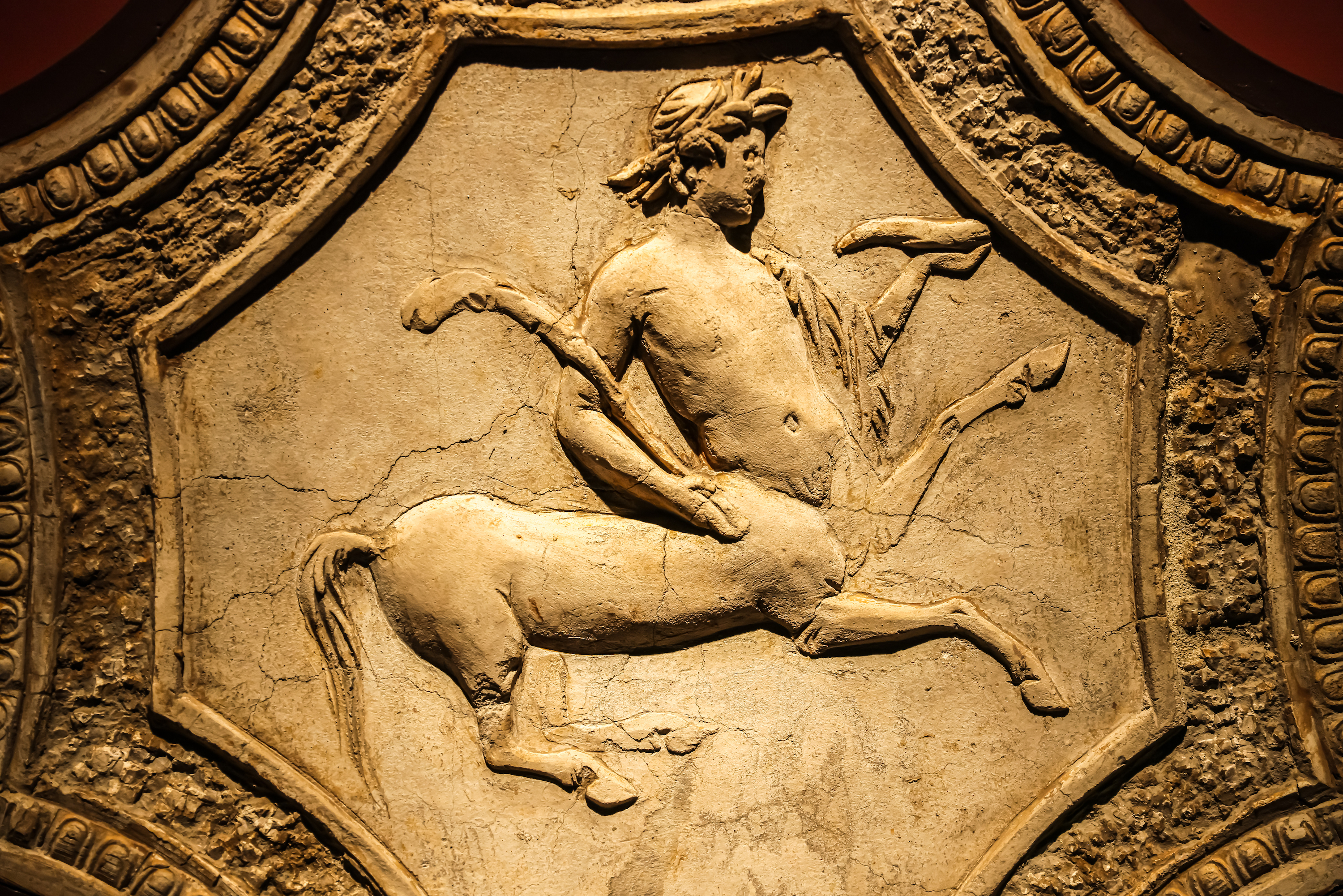 展览现场,地面为《狮子和酒神游行场景⻢赛克》石质⻢赛克,公元前1世纪,庞⻉,那不勒斯国家考古博物馆藏;墙面为《粉饰灰泥吊顶》,灰泥,公元1世纪,维苏威火山遗址,那不勒斯国家考古博物馆藏