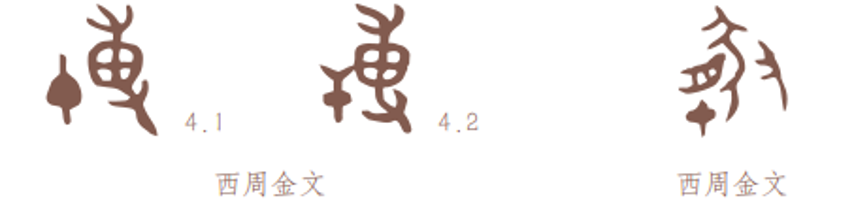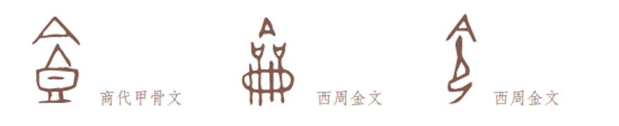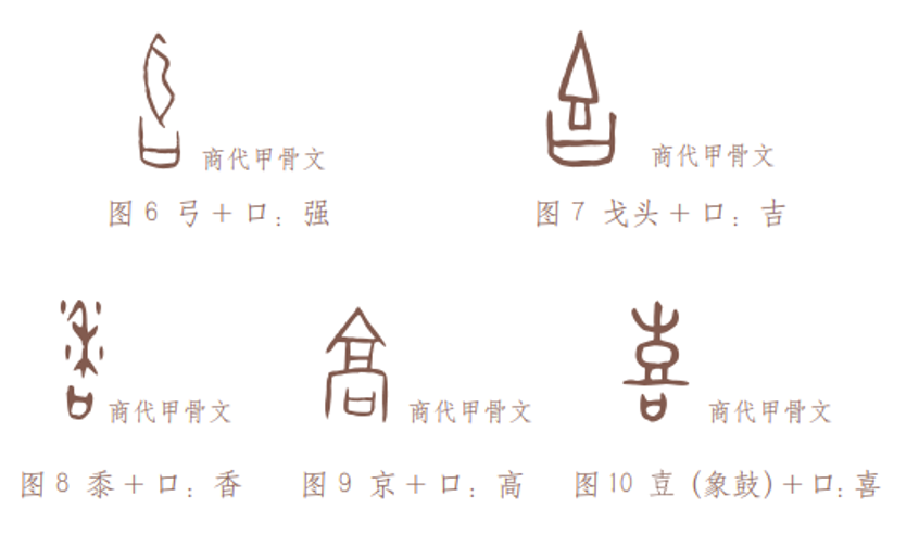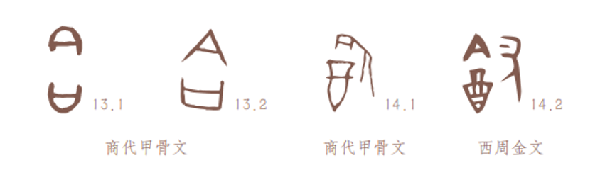 古文字“合”(左一、左二)和古文字“饮”(右一、右二)。文字上部的“倒口”写成A形的现象,还见于“食”字,以“倒口”对着一个饭食器“簋”上突出的谷物,表示进食;见于“龠(yuè)”字,以“倒口”对着一排带吹嘴的竹管,表示排箫类的乐器“籥”;见于“令”字,以“倒口”对着一个跪坐的人形,表示上对下发号施令。