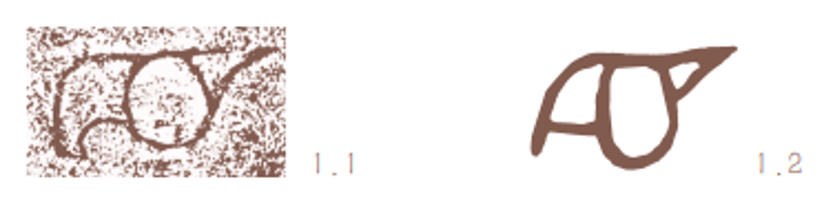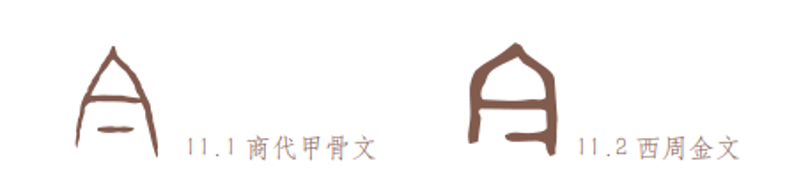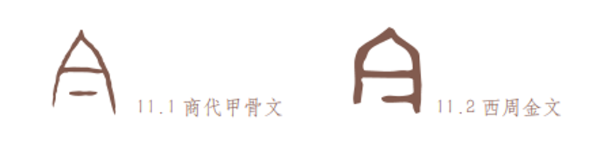 古文字“口”“曰”。当“口”因构形的需要而倒置的时候,其中的弧笔往往会被写成折笔(或许是为书写或刻划的便利)。如“合”字本作两“口”相对之形,可能是对答的“答”的初文;“饮(飲)”字本作一人俯首张口饮酒之形,后来上部的“倒口”都变成了A。