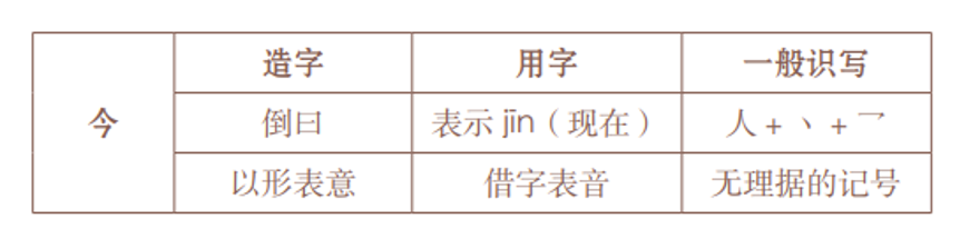 古文字“食”(左),古文字“龠”(中)和古文字“令”(右)。由此可见,“今”字原本是由“倒口”和一短横组成的,也就是“倒曰”。“倒曰”很可能表示与“曰”相对的某种情形。结合读音看,“今”应该是为“吟(jìn)”所造的字。“吟(jìn)”字本表示闭口不言,是“噤”的异体。“噤”字因为保留在成语“噤若寒蝉”中而为当代人所熟悉。其中的“口”“禁”都表意(“禁”还表音),合起来,就是闭口不言的意思。在古书中,“吟”字除了表示吟诵、呻吟的吟(yín),也保留了和“噤”相同的用法。比如《史记·淮阴侯列传》有“虽有舜禹之智,吟(jìn)而不言,不如喑聋之指麾也”。此外还有写作“唫”的,比如《墨子·亲士》有“臣下重其爵位而不言,近臣则喑,远臣则唫(jìn)”。可见“吟”“噤”“唫”都是为表示闭口不言的jìn所造的形声字。和“古”的情况类似,大概也是因为太难画了,古人并没有用表意的方式为表示现在的jīn造字,而是借用了和jīn同音的“今”字来表示。而当“今”普遍被用为今天的jīn之后,人们又造了“吟”“噤”“唫”等形声字来表示“今”的本义,以填补“今”被久借不还而留下的空档。于是,对于“今”,我们也可以从三个层面来分析:在“造字”层面,“今”是表意的,用“倒曰”表示闭口不言;在“用字”层面,从商代文字开始,“今”就普遍被借来表示今天的jīn,这时,“今”其实是表音的。当然,对于绝大部分汉字使用者而言,“今”也只是一个由“人丶乛”构成的,无理据的记号而已。“今”字的三个层面,也可以用一个表格来概括: