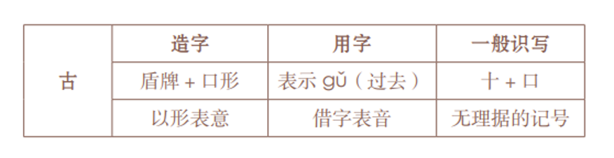分别为“强”“吉”“香”“高”“喜”。由此可见,在象盾牌的一竖画穿过一个方框或墨团的构件下加“口”组成“古”字,原本很可能表示盾牌的某种特征。结合“古”的读音看,“古”字应该是为坚固的“固”所造的,它的本义就表示盾的特征——坚固。那么,原本表示坚固的“古”字,和它一般用来表示的词——古代的gǔ——之间,是什么关系呢?最有可能的情况是,古人并没有用表意的方式为gǔ造字,大概因为太难画了,就直接借用了和gǔ同音的“古”字来表示。而当“古”普遍被用为古代的gǔ之后,人们又造了一个形声字“固”来表示“古”的本义,以填补“古”被久借不还而留下的空档。也就是说,在“造字”层面,“古”是表意的,它的构件都是有意义的符号。而在实际“用字”的层面,从很早开始,“古”就被借来表示古代的gǔ。在绝大多数时候,“古”可能只是表音的(“古”和“固”的词义或许也有关,这里暂不讨论)。不过,对于绝大部分汉字使用者而言,“古”字表音还是表意其实并不重要。最晚从东周时代开始,人们就已经把它当作上“十”下“口”的构件组合,对于一般学字或日常用字的人而言,“古”既不表音,也不表意,只是一个毫无理据的、让人强制记忆的符号(可称为“记号”)而已。关于“古”字的三个层面,我们可以用一个表格来概括: