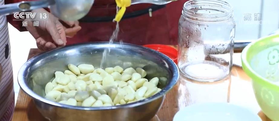 腌腊八蒜则把剥皮的大蒜瓣儿装进密封的容器,泡上醋和淡盐水,放置20来天。此时的蒜瓣颜色呈翠绿色,味道也变成了酸中带辣,令人垂涎。
