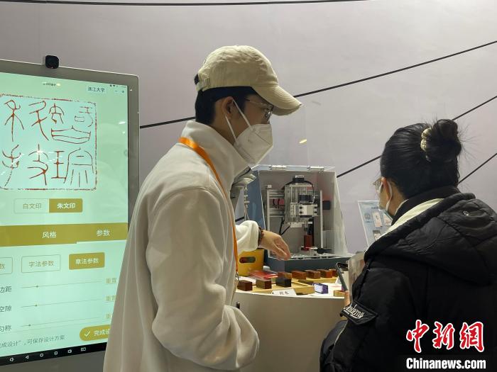 参展团队向观众介绍AI智能篆刻设备。童笑雨摄
