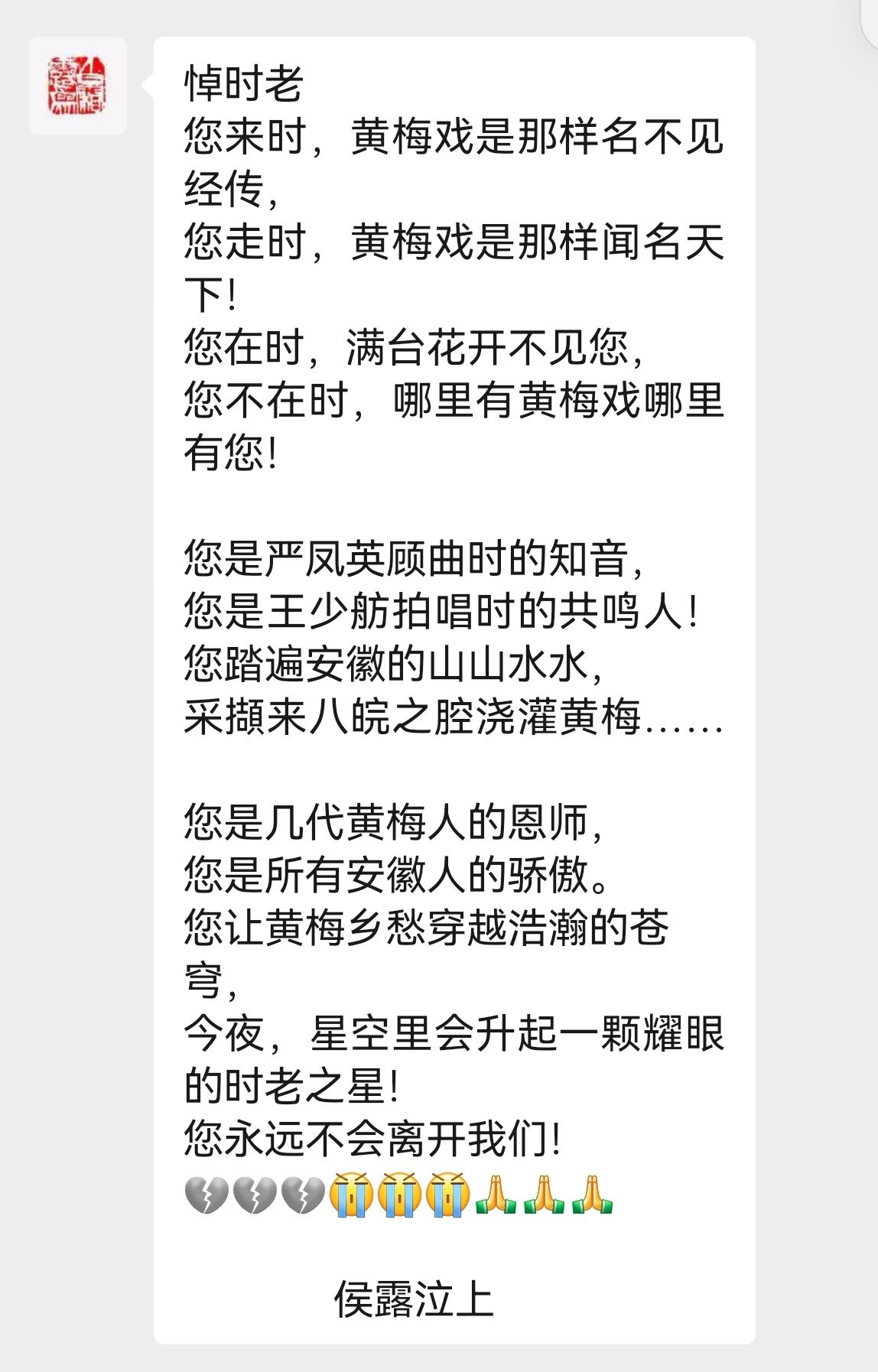 黄新德、蒋建国、吴琼、李春荣等黄梅戏业内人士纷纷在朋友圈悼念时老。